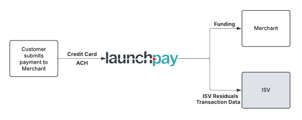 All transaction data is automatically routed to the Launchpay platform, regardless of the integration method, facilitating comprehensive reporting capabilities and merchant funding. See below for a basic transaction flow: